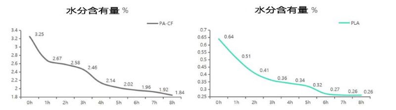 Fig4. 指定された時間乾燥を行うとフィラメントの水分子含有量が大幅に減少し、造形品質が飛躍的に向上します。
